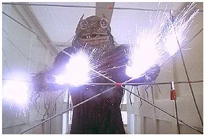 The chlorine has no effect so Maya tries the tranquilizer gun. It also has no effect. The creature throws Maya into the door controls shorting them out. Tony has to break the window to give her an exit. They get away, but Maya is beginning to believe there is no stopping this creature. Tony, unwilling to give up, comes up with an idea to try to attack the cloud to see if they can affect its control over the beast. They go to the weapons section and fire the laser cannon into the cloud. The cloud thins and they see a diamond shape within. They target the object and it splits in two. As they monitor the creature it is disoriented. They think they have succeeded until the two halves rejoin. The voice from the cloud taunts them. They fire and split it again, then split both halves. All four pieces rejoin to the great amusement of the cloud. Realizing that this, too, was futile, they join Bill Fraser, who has completed his work on the electrical barrier, and wait for the creature to arrive. When it does, it tests the barrier and is repelled. But it gets up and tries again. The barrier weakens with its second attempt.