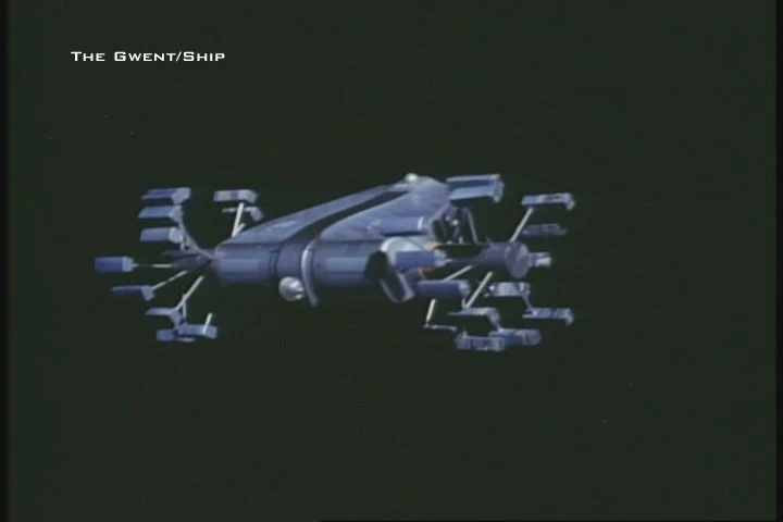 Gwent was built in two scales (plus larger sections for the lift and Eagle docking). The big model was smashed by Nick Allder immediately after filming, in frustration after problems making the ship roll correctly.